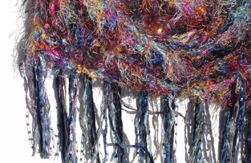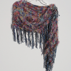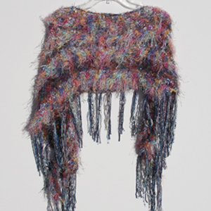 #614 Rainbow/Blue ShrugMaterials: Polyester, Mohair, Nylon, Wool, Cotton, Rayon, Hand-dyed ribbon Colors: Multi-color, Red, Blues, Brown, Gold, Rust, Sea Mist, Lavender Approximate Size: 74 " x 22 1/2 "