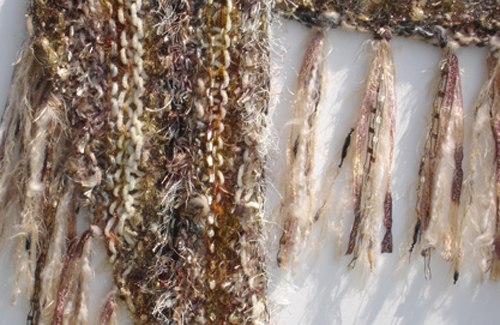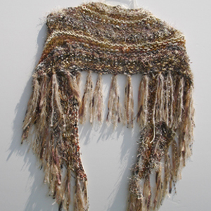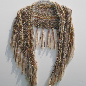 #875 Beige & Brown ShrugFeaturing Fibers From: Italy, Turkey Materials: Acrylic, Polyester, Nylon, Cotton, Wool worsted, Mohair, Cotton perle Colors: Beige, Champagne, Browns, Golds, Taupe, Silver, Black, Tan, Grey, Rust, Orange, Blue Approximate Size: 64 " x 19 1/2 "