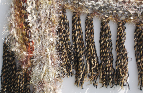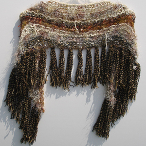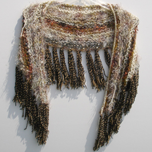 #878 Beige & Brown (Tiger Eye) ShrugFeaturing Fibers From: Italy, Turkey Materials: Polyester, Nylon, Cotton, Wool worsted, Mohair, Cotton perle Colors: Beige, Champagne, Browns, Golds, Taupe, Silver, Black, Tan, Grey, Rust, Orange, Blue Approximate Size: 53 " x 15 "