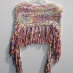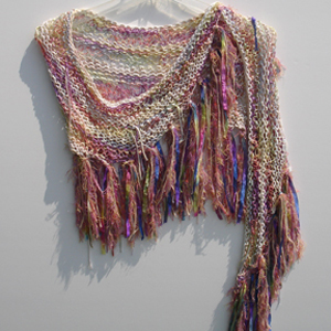 #884 Summer Ribbon Rainbow ShrugFeaturing Fibers From: Italy Materials: Rayon, Metallic, Nylon, Cotton, Acrylic, Polyester, Lurex Colors: Rainbow, Silver, Pink, White, Fuschia, Purple, Tan, Pinks, Orange Approximate Size: 68 " x 22"