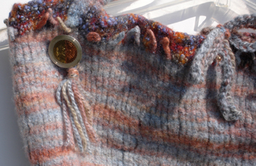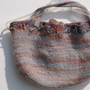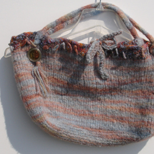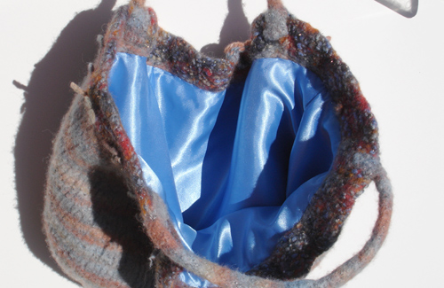 #911 Blue/Orange Felted PurseFibers From: Italy Materials: Wool, Acrylic, Polyester, Nylon, Bright Blue Satin Lining, Silver, Copper and Brass Pin Antique Pin, Tie Closure Colors: Blues, Orange, Silver Approximate Size: 18 1/2 " x 11 1/2 "