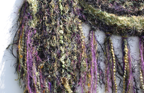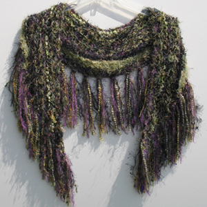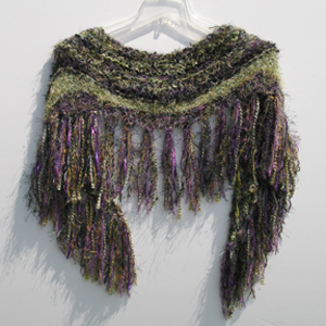 #914 Black/Green/Multi ShrugFeaturing Fibers From: Italy, Spain, Japan Materials: Acrylic, Polyester, Nylon, Cotton, Silk, Mohair, Wool Colors: Black, Green, Pink, Gold, Beige, Purple, Violet, Mossy Greens, Brown, Blue Approximate Size: 56 1/2 " x 17 "