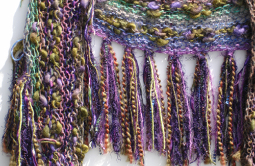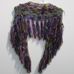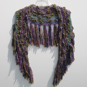 #917 Knubby Green, Purple, Blue Wool/Silk ShrugFeaturing Fibers From: France, Japan, Spain, Italy Materials: Wool, Silk, Mohair, Cotton, Nylon, Acrylic, Polyester Colors: Greens, Purple, Blue, Gold, Violet, Pink Approximate Size: 60 1/2 " x 17 "
